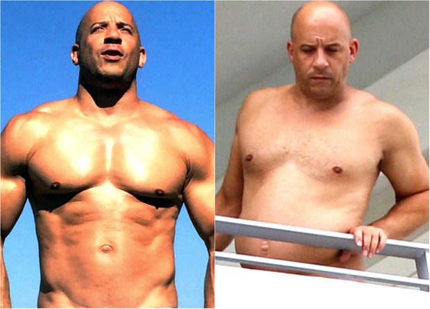 Conhecido tanto pela atuação nos filmes da saga "Velozes e Furiosos" quanto pelo corpo hipermusculoso, Vin Diesel surpreendeu nesta semana, ao ser fotografado na sacada de um prédio ostentando uma "barriga de chope" de respeito. O ator, aliás, está longe de ser o único famoso a ter descido ladeira abaixo no quesito boa forma.