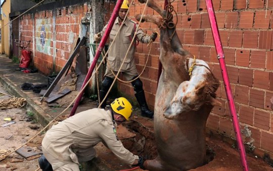 Os bombeiros também precisaram resgatar uma égua de dentro de uma fossa em Águas Lindas de Goiás, no Entorno do Distrito Federal, também no domingo. De acordo com a corporação, o animal caiu dentro do buraco de cerca de 3 metros de profundidade que tinha rejeitos no fundo.