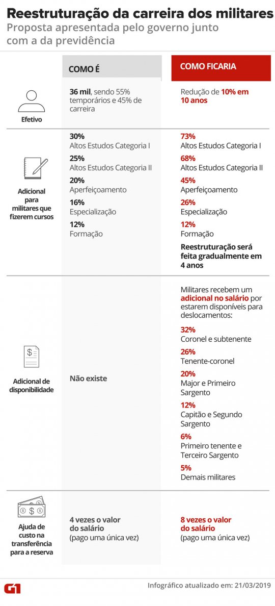 Apresentada no fim do mês passado, a proposta de reestruturação de carreira dos militares, se aprovada pelo Legislativo, custará R$ 86,6 bilhões em dez ano e prevê as seguintes mudanças, dentre outras: