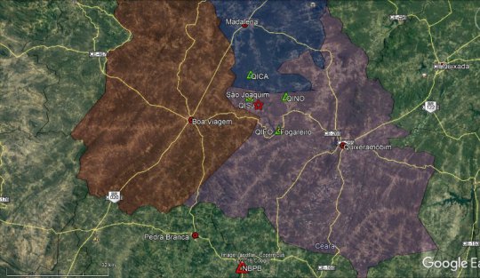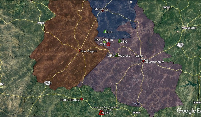 Epicentro está representado pela estrela vermelha. O triângulo vermelho mostra a localização da estação de Pedra Branca (NBPB.) Os triângulos verdes representam as estações sismográficas instaladas na região.
