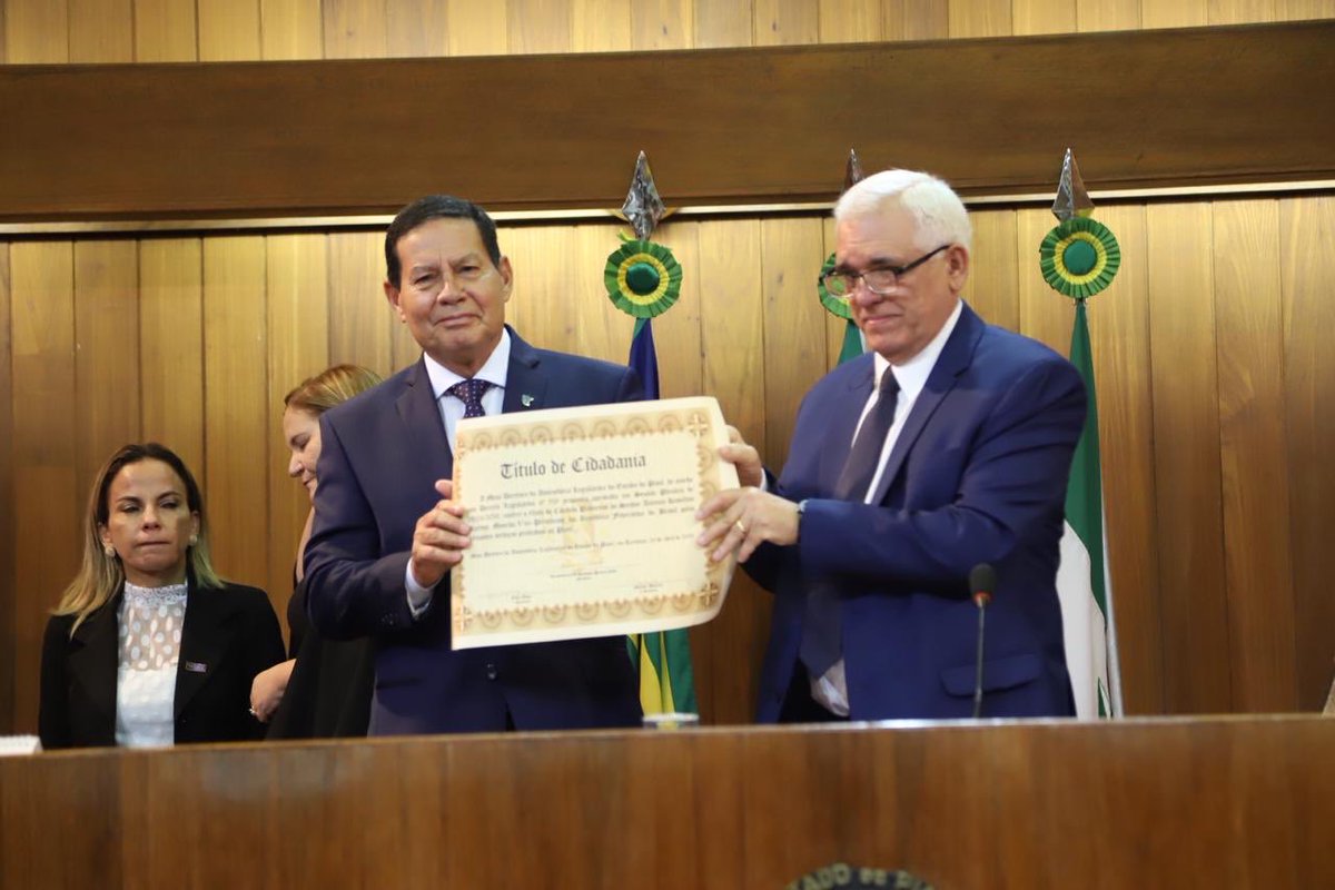 O vice-presidente da república, general Hamilton Mourão (PRTB), recebeu o título de cidadão piauiense nesta sexta-feira (26) em solenidade realizada na Assembleia Legislativa do Piauí (Alepi). Ele lembrou da origem de sua família, na cidade de Pedro II, e se emocionou ao falar de sua família paterna.