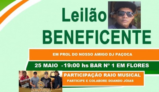 O leilão do radialista Dj Paçoca acontecerá no dia 25 de maio às 19hrs, no Bar Nº 1, no Bairro de Flores, com música ao vivo com a Banda Raio Musical, participe e leve uma jóia.