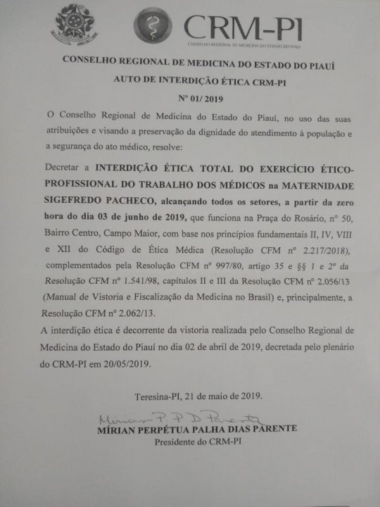 A interdição é decorrente da vistoria realizada pelo Conselho Regional de Medicina do Estado do Piauí no dia 22 de abril de 2019, decretada pelo plenário do CRM em 20 de maio de 2019.