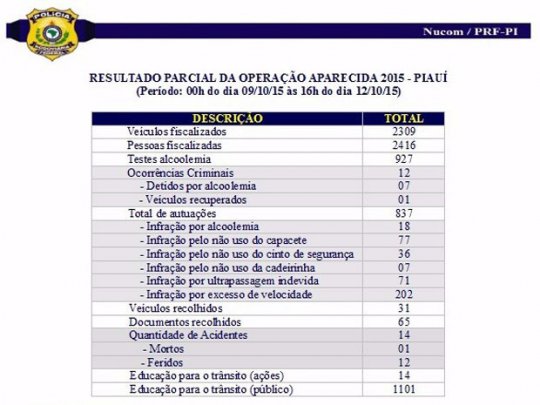 A Polícia Rodoviária Federal (PRF) divulgou, na tarde desta segunda-feira (12), dados parciais da Operação Aparecida 2015. Até o momento já foram registrados 14 acidentes com um morto e quatro feridos neste feriado prolongado.
