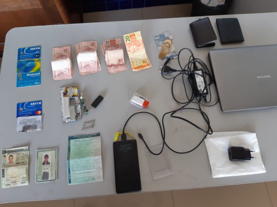 Após verificarem no interior do veículo foram encontrados equipamentos utilizados na subtração de valores de caixas eletrônicos, comumente chamado “Chupa Cabras”. Foi encontrado também dois dispositivos metálicos com componentes eletrônicos instalados, um deles com uma câmera com um cartão Micro SD e entrada USB.