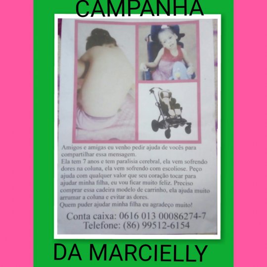 A família de Maria Marcielly de Macedo Bandeira, de 7 anos, que reside na localidade Água Fria, zona rural de Campo Maior, está realizando uma campanha para conseguir fundos para compra de uma cadeira modelo carrinho para melhor locomoção e para coluna de Marcielly.