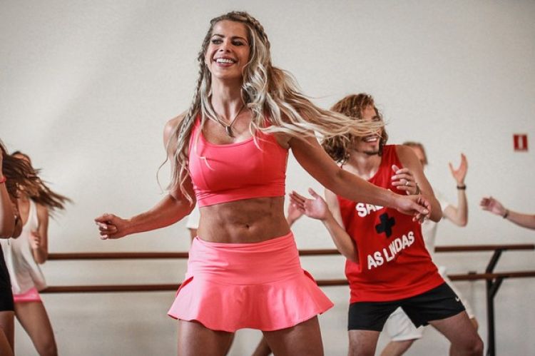De top e minissaia, Karina Bacchi exibiu toda sua boa forma em uma aula de zumba nesta quinta-feira, 15, em São Paulo. A musa fitness reuniu alguns de seus seguidores nas redes sociais para malharem juntos.