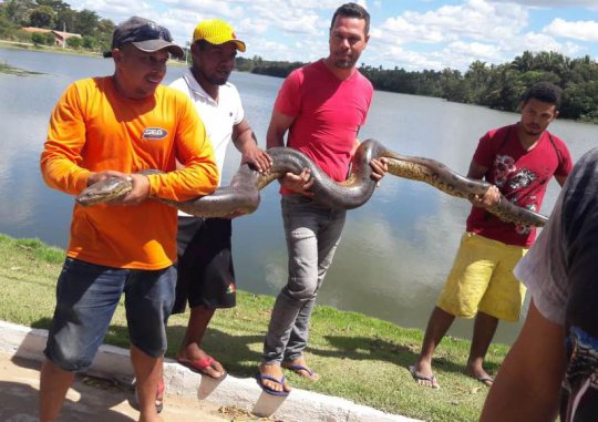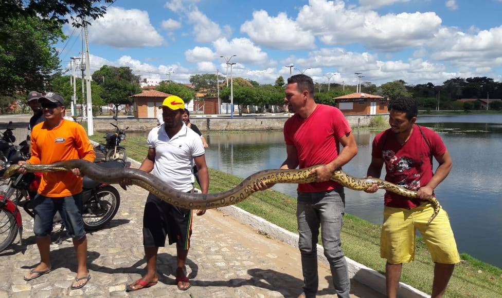 Uma cobra da espécie Eunectes Murinus, ou Sucuri-Verde como é conhecida, medindo quase quatro metros de comprimento e quase 50kg, foi capturada por populares nas proximidades de um açude na cidade de Água Branca-PI, a 98 km ao centro-sul de Teresina, na manhã desta quarta-feira (24/07). No momento da captura, a serpente estava tentando atravessar a parede de contenção da água, entrando para o lago.