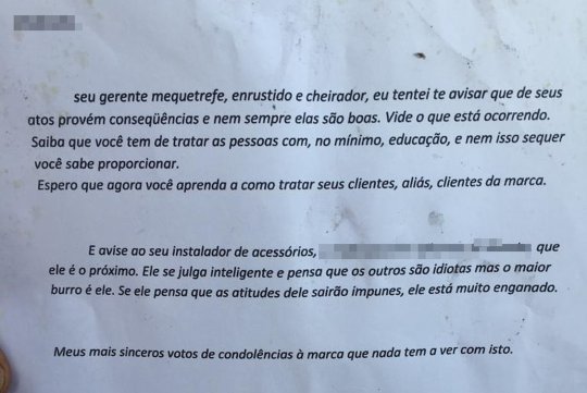 O autor da carta também faz ameaças a um instalador de acessórios. Ele termina pedindo desculpa para a empresa. “Meus mais sinceros votos de condolências à marca que nada tem a ver com isso.”