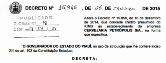 Sobre a concessão de benefícios ao Grupo Petrópolis, em decreto assinado por Wellington Dias em janeiro de 2015, o governo do Piauí divulgou a seguinte nota: