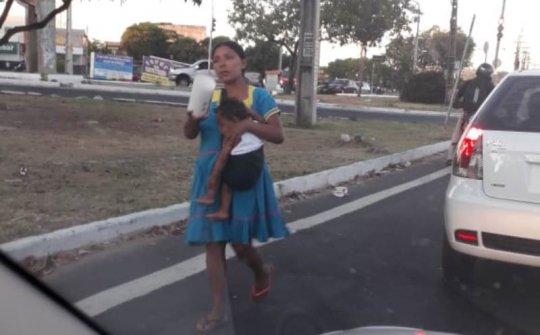 Mãe venezuelana com bebê de colo em sinal de trânsito de Teresina. Foto: Domingos José/Campo Maior Em Foco