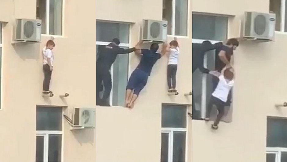 Homem se arrisca para salvar menino pendurado em janela de prédio na Rússia: Vídeo