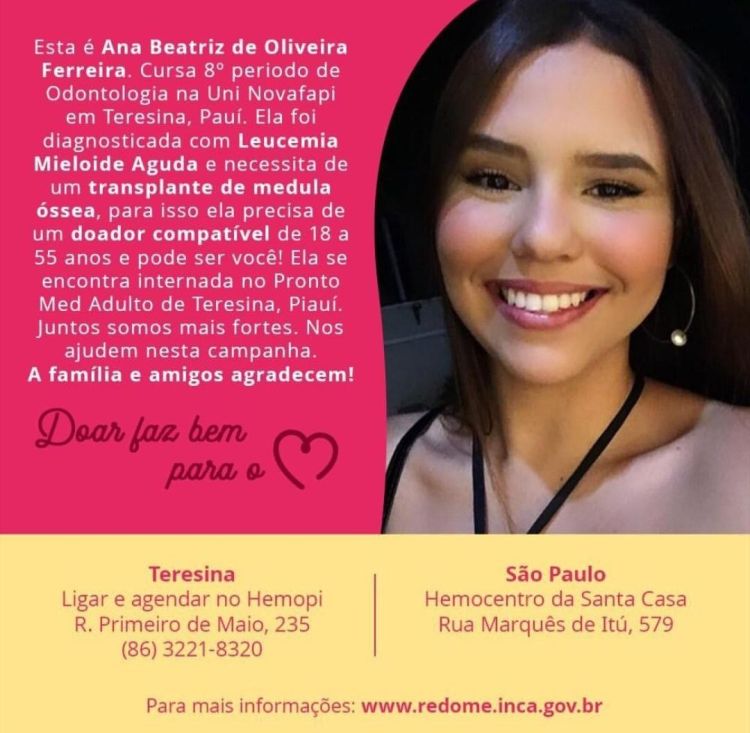 A estudante campomaiorense Ana Beatriz de Oliveira Ferreira, de 21 anos, que cursa o 8º período de Odontologia na UniNovafapi, recentemente foi diagnosticada com Leucemia Mieloide Aguda e necessita de um transplante de medula óssea com urgência.