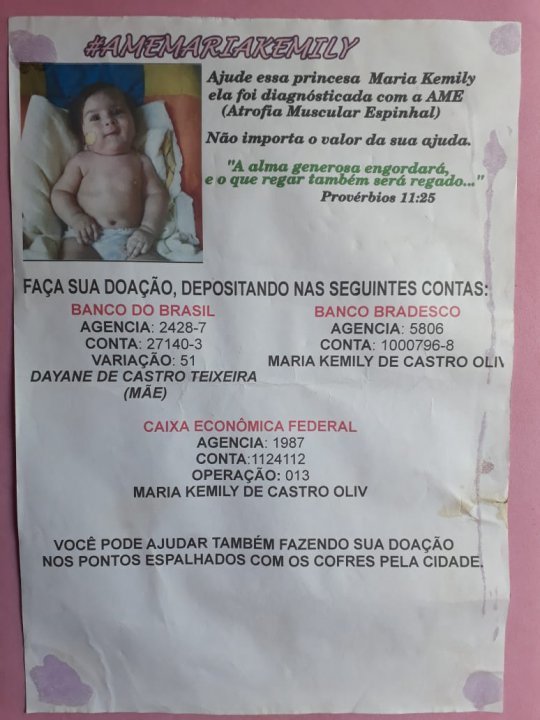Maria Kemily de Castro Oliveira, de apenas 7 meses, residente na cidade de Milton Brandão, está precisando de ajuda. A criança, que é filha de pessoas humildes, foi diagnosticado com AME, Atrofia Muscular Espinhal, uma doença rara que gera fraqueza muscular e degeneração progressiva. Normalmente, crianças com essa condição têm uma expectativa de vida de no máximo dois anos.