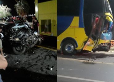 O impacto do acidente deixou o carro totalmente destruído e a frente do ônibus danificada.