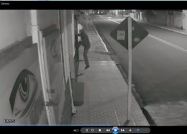 O ladrão aparece com parte do roso coberto pela camisa, arranca uma das câmeras de vigilância do local. Quase meia hora depois ele reaparece e devolve a câmara.