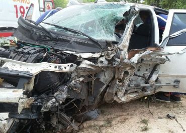 Um carro de passeio invadiu a pista contrária e colidiu contra uma carreta. O motorista do carro ficou preso às ferragens