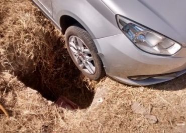 Ao passar pelo local foi surpreendida com um grande buraco fazendo com que seu veículo caísse dentro do mesmo.