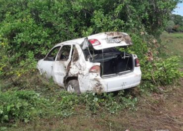 Ao retornar da praia o veículo saiu de uma curva, rodou na pista e capotou, indo de encontro ao meio da vegetação.
