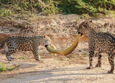 Mãe e filhote de onça são flagrados por turistas ao atravessarem rio carregando sucuri