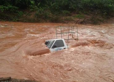 O carro ficou praticamente imerso e precisou ser amarrado com cordas para não ser levado pela correnteza.