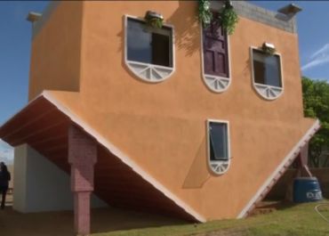 Construção tem telhado encostado no gramado e porta é invertida. Dono diz que, após se aposentar, quis fazer algo diferente.