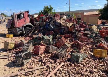 O motorista do caminhão carregado de batatas perdeu o controle do veículo após passar sobre um quebra molas e colidiu na motocicleta