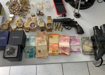 Foram apreendidos dois tabletes de crack, duas pedras de cocaína, porções de maconha, invólucros plásticos, balanças de precisão e duas armas de fogo