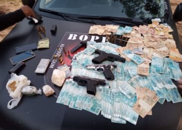Foram apreendidos quatro sacos com cocaína, maconha e crack, além de três pistolas, dois carregadores de arma e 61 munições.
