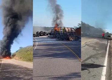 Caminhão carregado de vidro tomba, pega fogo e deixa uma pessoa morta no Piauí