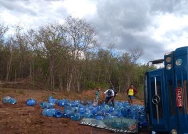 Não foi registrado feridos, nem as causas do acidente. Galões de água mineral ficaram espalhados no local.