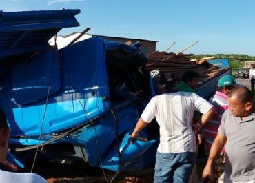 Devido a parada brusca toda a carga de madeira foi arremessada para frente, esmagando a cabine do motorista