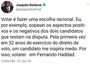 Ex-ministro do STF, Joaquim Barbosa diz que Bolsonaro inspira medo e revela voto no Twitter