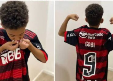 Filho de jogador do Altos (PI) recebe camisa do Flamengo de Gabigol