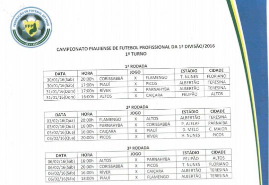 A Federação de Futebol do Piauí (FFP) divulgou nesta terça-feira (01/12) a tabela detalhada do Campeonato Piauiense do próximo ano. Ajustada aos clubes piauienses que disputam a Copa do Nordeste e Copa do Brasil, a tabela marca jogos para o meio e final de semana, bem como em datas festivas como a pascoa.