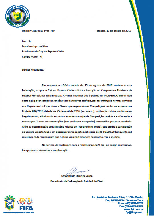 O documento faz referência a punição sofrida pelo Caiçara ao deixar de ir a campo por dois jogos consecutivos quando disputou a Série A do Estadual no ano de 2016. O clube foi afastado automaticamente e deve permanecer dois anos fora de competições. O ofício explica ainda que a FFP não pode aceitar o time na segunda divisão devido uma determinação do Ministério Público do Trabalho que proíbe sua inscrição sob pena de R$ 50 mil.