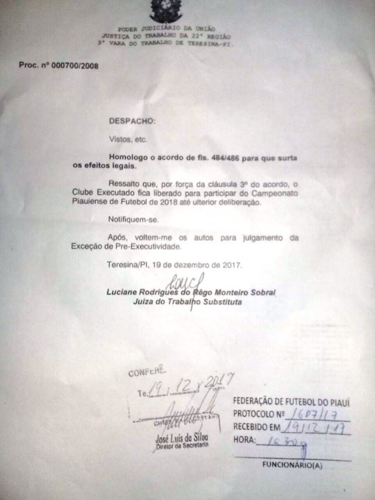 A Justiça do Trabalho liberou o Caiçara de Campo Maior para disputar as competições da Federação de Futebol do Piauí (FFP) do próximo ano. A decisão foi proferida nessa terça-feira (19/12) pela juíza substituta Luciane Rodrigues Rêgo e logo em seguida protocolada na Federação.