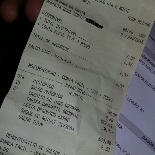A conta da aposentada deveria R$ 560,00 por que ela já tem um empréstimo em sua aposentadoria. Depois do golpe, ficaram apenas R$ 2,32. Ela diz que tem pressão alta, diabetes, é viúva, mora apenas com um neto e não vai ter como quitar suas contas.