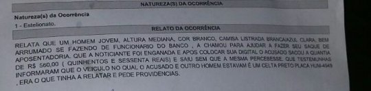 A aposentada conta que esperou um tempo, a máquina fez uma zuada e ela resolveu sair pra procurar pelo rapaz e já viu um funcionário do banco que estaria ligando para a polícia, dizendo que se tratava de um estelionatário. O homem havia fugido em um carro que teria placa do estado do Ceará.