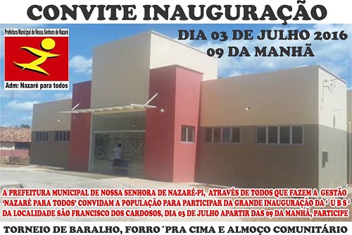 À administração Nazaré para Todos, Prefeito Zé Henrique, vem convidar toda a população para a inauguração da unidade básica de saúde, Luiz Cardoso da Silva, no Povoado São Francisco dos Cardosos.