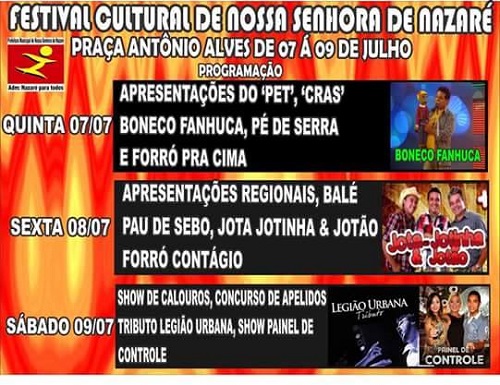 Ainda tem apresentações de boneco FANHUCA,JOTA JOTINHA & JOTÃO ,Balé, apresentações do município e muitas que não fazem parte do festival de Cultura, enfatiza o secretário Paulo Cruz, mais que tem a finalidade de aquecer o comércio local, os barraqueiros e etc..., esse é nosso último grande evento da gestão de 4 anos de muita dificuldade, problemas enfrentados, mas com os pés no chão, e a parceria deste jovem prefeito José Henrique que não mede esforços pelo bem da cidade e sempre buscando o crescimento da mesma.