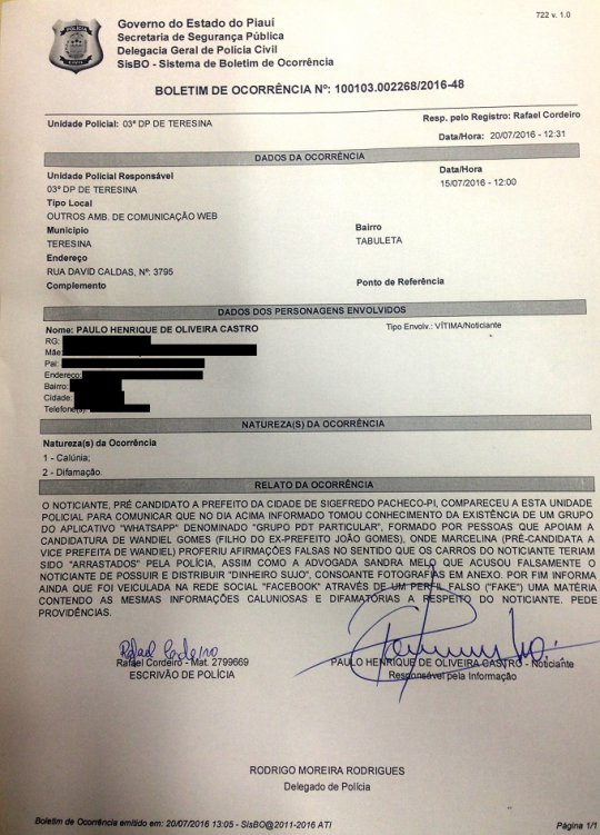 Paulo Henrique esteve nesta quarta-feira no 3º Distrito Policial no Bairro Tabuleta, em Teresina, para registrar Boletim de Ocorrência. Ele argumenta que houve afirmações e acusações falsas a seu respeito, feitas por membros do grupo, e que um “fake”, perfil falso no facebook, também publicou matéria com as mesmas informações.