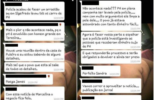 “Acho difícil o PH quer ser vice. Os amigos e patrocinadores dele aqui de SP [São Paulo] não aceitam” diz outro trecho de conversa. A idéia do grupo é espalhar que a polícia estaria em Sigefredo Pacheco investigando o patrimônio do pré-candidato. “Pessoal não é melhor aguardar?” indaga outro membro do grupo.