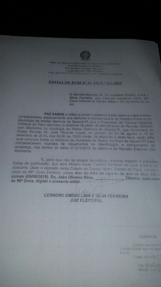 Do dia 24 de Agosto a 18 de Setembro, a justiça eleitoral estará no nosso Município de Nossa Senhora de Nazaré fazendo cadastramento biométrico onde também será feito inscrição ou tranasferência de domínio eleitoral.
