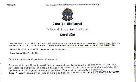 O Tribunal Superior Eleitoral não registra que Marcelina seja filiada a partido político