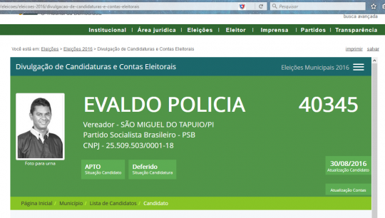 O candidato ANTONIO EVALDO PEREIRA DA CRUZ vulgo “Evaldo Polícia” pelo Partido Socialista Brasileiro(PSB) teve sua candidatura Deferida nesta quarta-feira 31/08 por volta de 11h32min, o Tribunal Superior Eleitoral – TSE, registrou sentença do dia 30/08 terça-feira, deferindo o pedido.