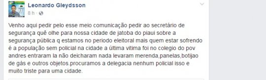 A Escola Municipal Francisco Luis, no Povoado Andrés na zona rural de Jatobá do Piauí foi arrombada no final de semana. Os criminosos levaram até os tachos de fazer a merenda. A notícia foi denunciada nesta quinta-feira nas redes sociais, com pedido de socorro ao secretário de segurança do estado Fábio Abreu. É que no dia do ocorrido não tinha nenhum policial na cidade.