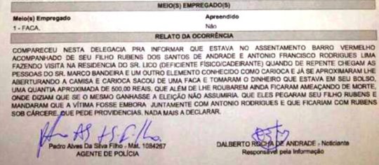 Segundo o Boletim de Ocorrência, Dalberto visitava uma família no Assentamento Barro Vermelho quando foi surpreendido pelos dois homens em uma moto. "Carioca dizia o tempo todo que iria me matar e mesmo que eu vencesse a eleição não assumiria. Já Marcos Bandeira retirou tudo que estavam eu meus bolsos" relata Dalberto.