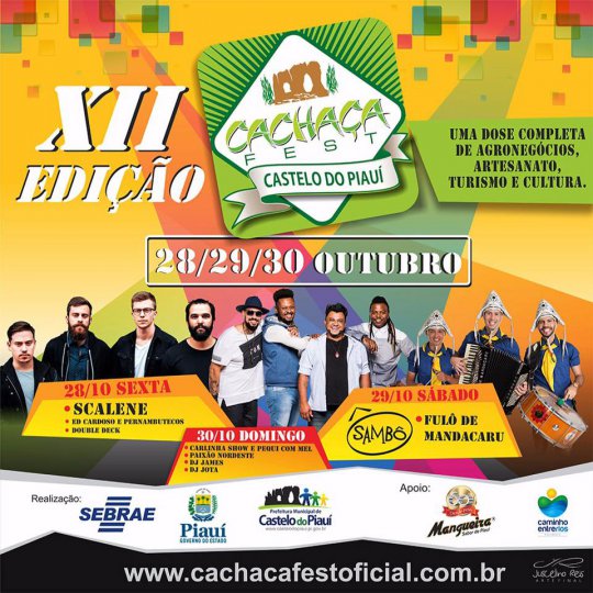 A organização do Cachaça Fest 2016 anunciou as datas e as atrações da 12ª edição do tradicional evento que acontece na cidade de Castelo do Piauí. Agronegócio, Artesanato, Turismo e Cultura serão regados com nove atrações musicais nacionais e locais nos dias 28, 29 e 30 de outubro.