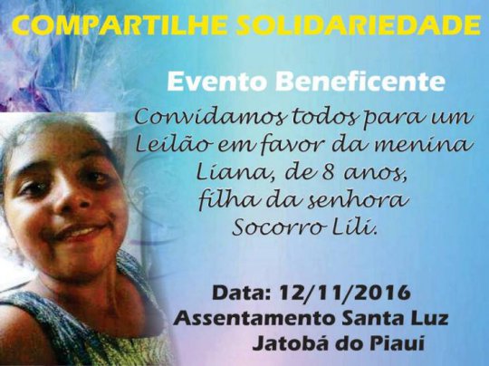 Familiares e amigos organizam para o próximo sábado, no Assentamento Santa Luz, em Jatobá do Piauí, um leilão para arrecadar dinheiro para o tratamento da garota Lyanna, de 8 anos de idade. Ela é filha da senhora Socorro Lili.